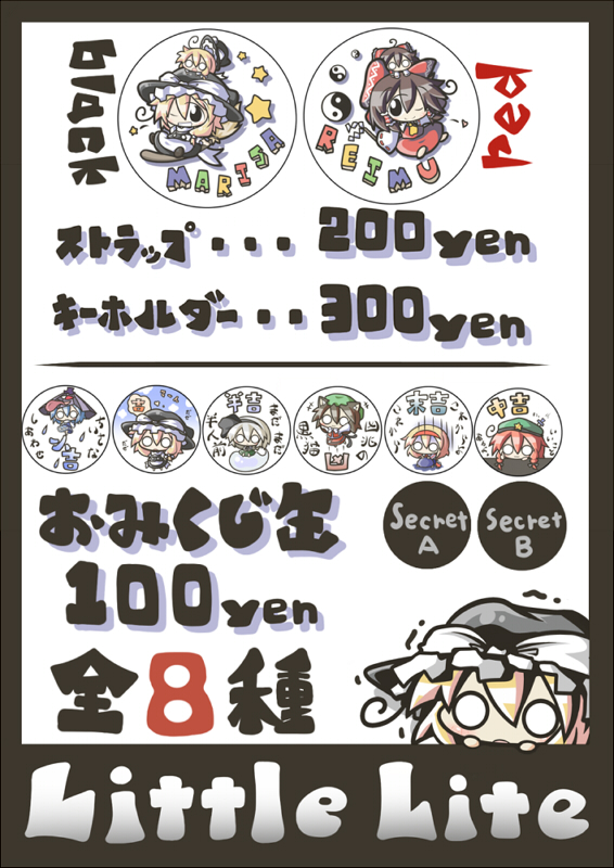 気づけばお祭りまで一週間をきってしまいました; 今回は初めて個人誌で本を作ってみました。コピー本なんて無かったw 新刊 「スペルボーダー!」 フルカラー20P、ちょっと小さめのA5サイズ。 頒価300円です。 こういうのが詰め込まれています。 ほんとは背景まっしろが多いですが・・w 会場ではオマケでアルミ(?)製の栞をお付けします。 本より若干数が少ないのでもしかしたら無くなってしまう、と、嬉しいな(ぉ 万一その場合は何かしらの過去作品をランダムでお付けしようかと思います。バッジ・・とかw 新作は以上ですが、前回作ったキーホルダー、ストラップも置かせていただく予定です。 どうぞよろしくおねがいします。 こいまりおつかれさまでした! 若干(?)のタイムラグがありますが師走ということで気にせず参りましょう(ぉ 直前になっちゃいましたがコミケ関連↓ 缶バッジのストラップ(小)とキーホルダー(大)です。 ストラップは200円、キーホルダーは300円。 お好きな方をどうぞw 同じく缶バッジですが、おみくじ仕様です。 一回100円で全8種のランダムです。 年明け前の運試しにいかがでしょうか。 それから前回のバックとマグカップを少数ですが持って行きます。 頒布物は以上です。 ・・すごく事務的になってしまった・・w スペースは【二日目東ツ-18b】です。 よろしければ後半の空いた時間の活用などにご利用くださいm(_ _)m 最後に嫁自慢。 \ぱねぇ/ いよいよです!! 見て周るのも楽しみだ~、時間がどう考えても足り、ぬ!! 当日はポスター掲げてお待ちしております、たぶん・・w 大⑨州では設営の時間足らなくて出せなかったので今回は手際よく動かないと・・ さて!たくさんの魔理沙に会えるのが楽しみです! 参加される方は一緒に楽しみましょう~♪ あ、それと頒布予定の缶バッジなんですが、こいまりの方ではバラで書く100円という形をとるかもしれません。 チビは5個のオマケという形で。 今回あまり数が用意できていないので纏めてしまうとほんとに小数になってしまうというのと、大⑨州で「一個ずつはだめですか?」っていう声も多かったので。 もっと最初からしっかり考えないとなぁ~・・;w